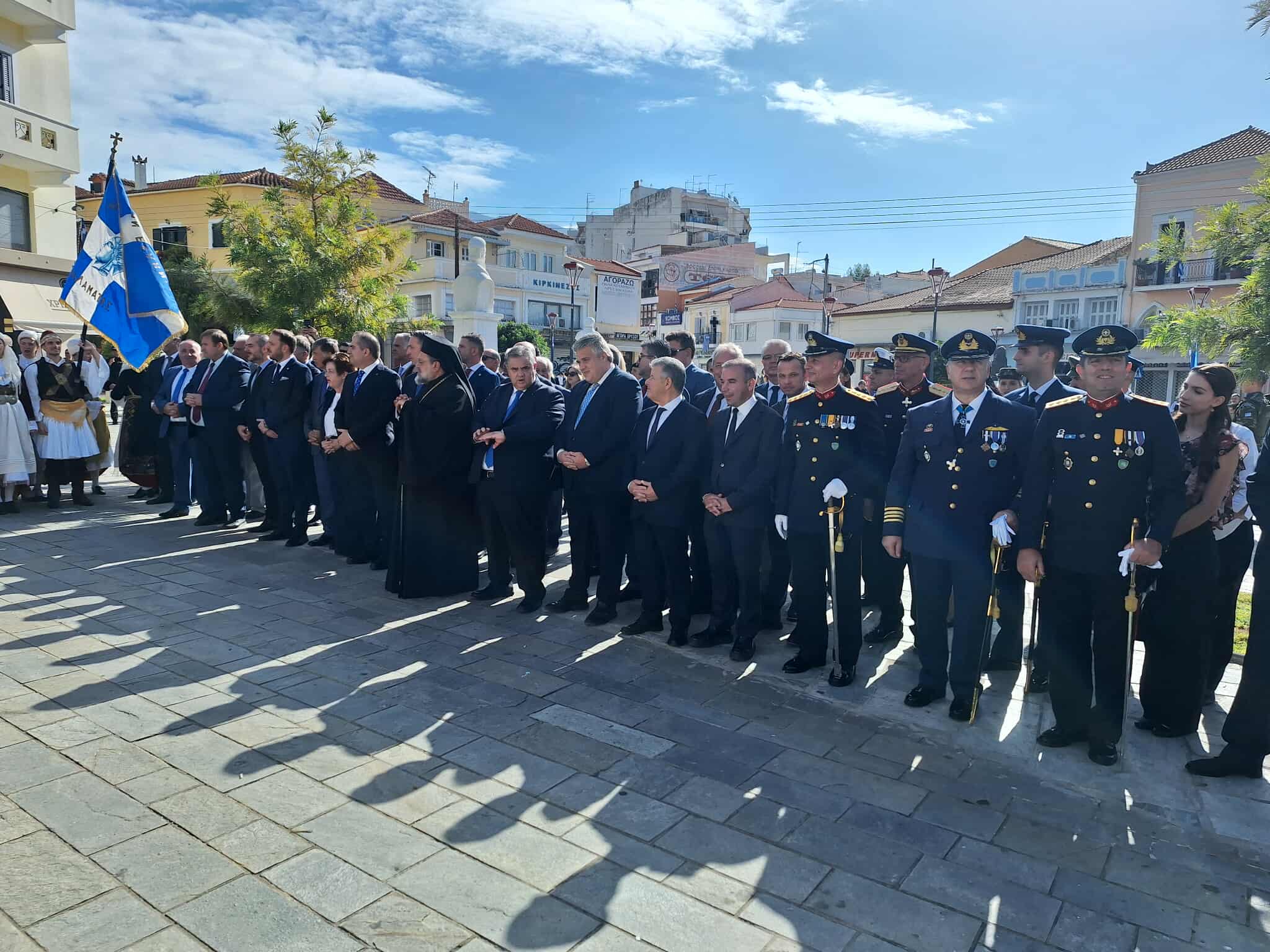 Την Κυβέρνηση, στον εορτασμό, που ξεκίνησε με δοξολογία στο Μητροπολιτικό Ιερό Ναό Υπαπαντής του Χριστού και συνεχίσθηκε με επιμνημόσυνη δέηση και κατάθεση στεφάνων στο Ηρώον της πλατείας 23ης Μαρτίου, για να ακολουθήσει η παρέλαση, εκπροσώπησε ο Υφυπουργός Εσωτερικών Βασίλης Σπανάκης.