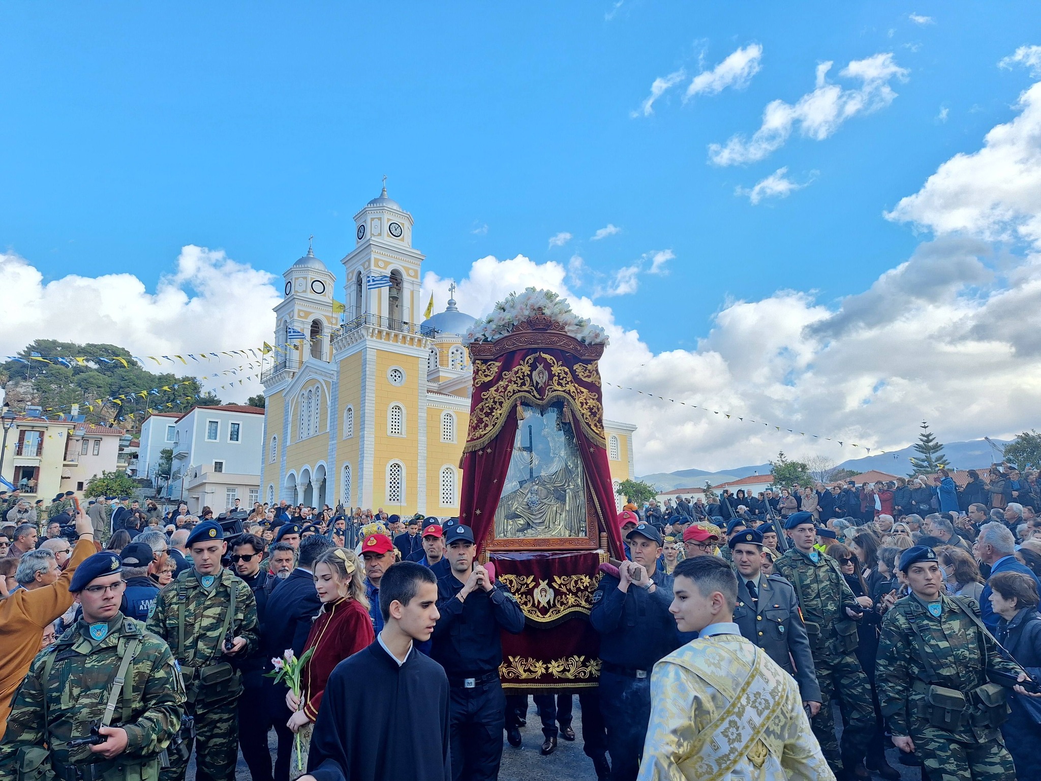 Με το πέρας της Θείας Λειτουργίας, ξεκίνησε η λιτάνευση της Iερής Eικόνας. Τιμές κατά τη λιτανεία απέδωσαν άγημα του Στρατού καθώς και Φιλαρμονικές.
