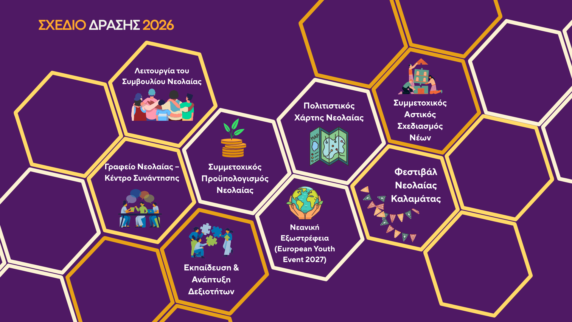 Στο επίκεντρο των προσεχών μηνών βρίσκονται δράσεις που ενισχύουν την ενεργή συμμετοχή των νέων και τον διάλογο μεταξύ των νέων, της Τοπικής Αυτοδιοίκησης και της ευρύτερης κοινότητας. Συγκεκριμένα, το σχέδιο δράσης που κατατέθηκε για την ανάδειξη της Καλαμάτας ως Εθνική Πρωτεύουσα Νεολαίας 2026 περιλαμβάνει τα παρακάτω: