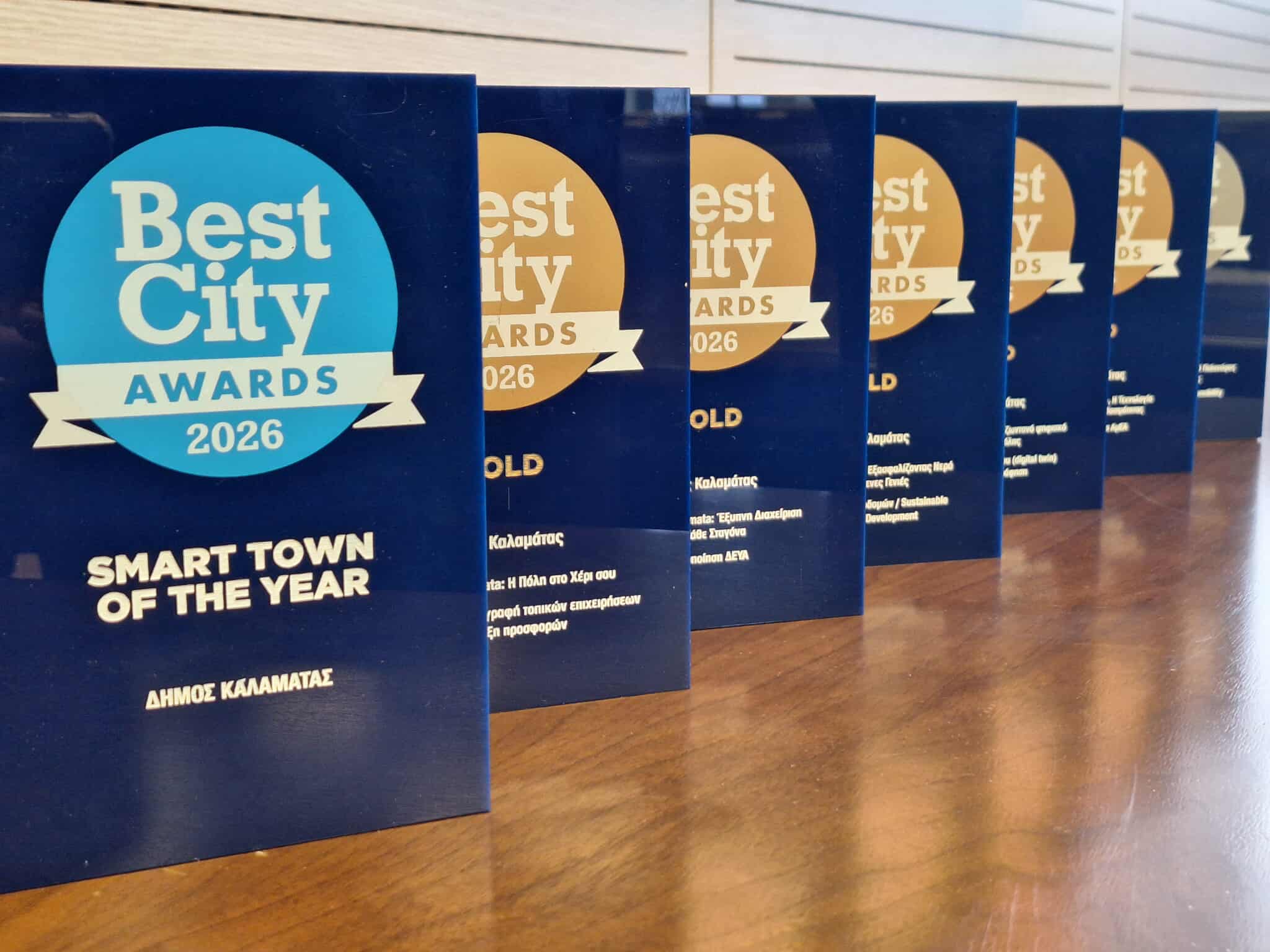 Επτά συνολικά βραβεία (Smart Town, 5 Χρυσά, 1 Ασημένιο) απέσπασε ο Δήμος Καλαμάτας στην τελετή των «Best City Awards 2026» που πραγματοποιήθηκε την Τετάρτη 11 Φεβρουαρίου 2026 στο Σεράφειο του Δήμου Αθηναίων. Στην τελετή παρέστησαν ο Α’ Αντιπρόεδρος της ΚΕΔΕ και Δήμαρχος Βάρης Βούλας Βουλιαγμένης Γρηγόρης Κωνσταντέλος, Περιφερειάρχες, Δήμαρχοι και πλειάδα αυτοδιοικητικών απ’ όλη τη χώρα.
