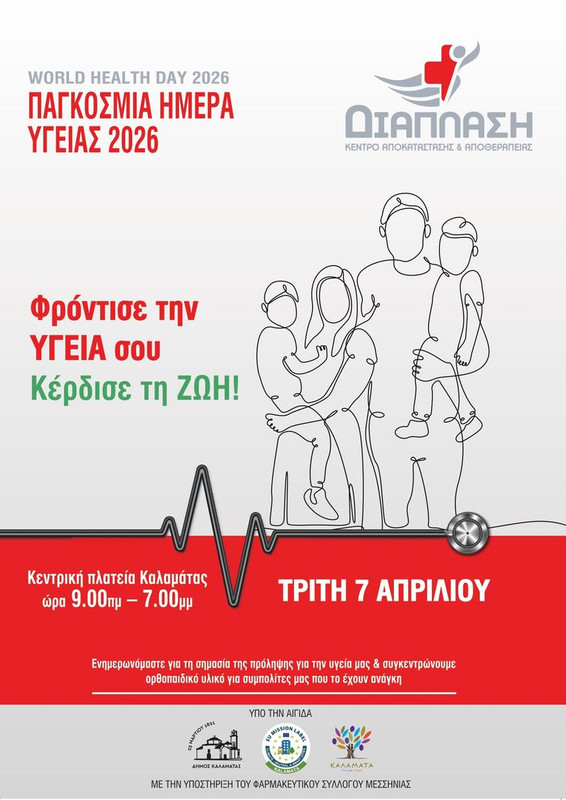 Με αφορμή την Παγκόσμια Ημέρα Υγείας, τη Μ. Τρίτη 7 Απριλίου 2026, το Κέντρο Αποκατάστασης «Διάπλαση» διοργανώνει δράση ενημέρωσης και ευαισθητοποίησης για την πρόληψη, στην Κεντρική Πλατεία - Βασ. Γεωργίου της Καλαμάτας. Η εκδήλωση τελεί υπό την αιγίδα του Δήμου Καλαμάτας και πραγματοποιείται με την υποστήριξη του Φαρμακευτικού Συλλόγου Μεσσηνίας.