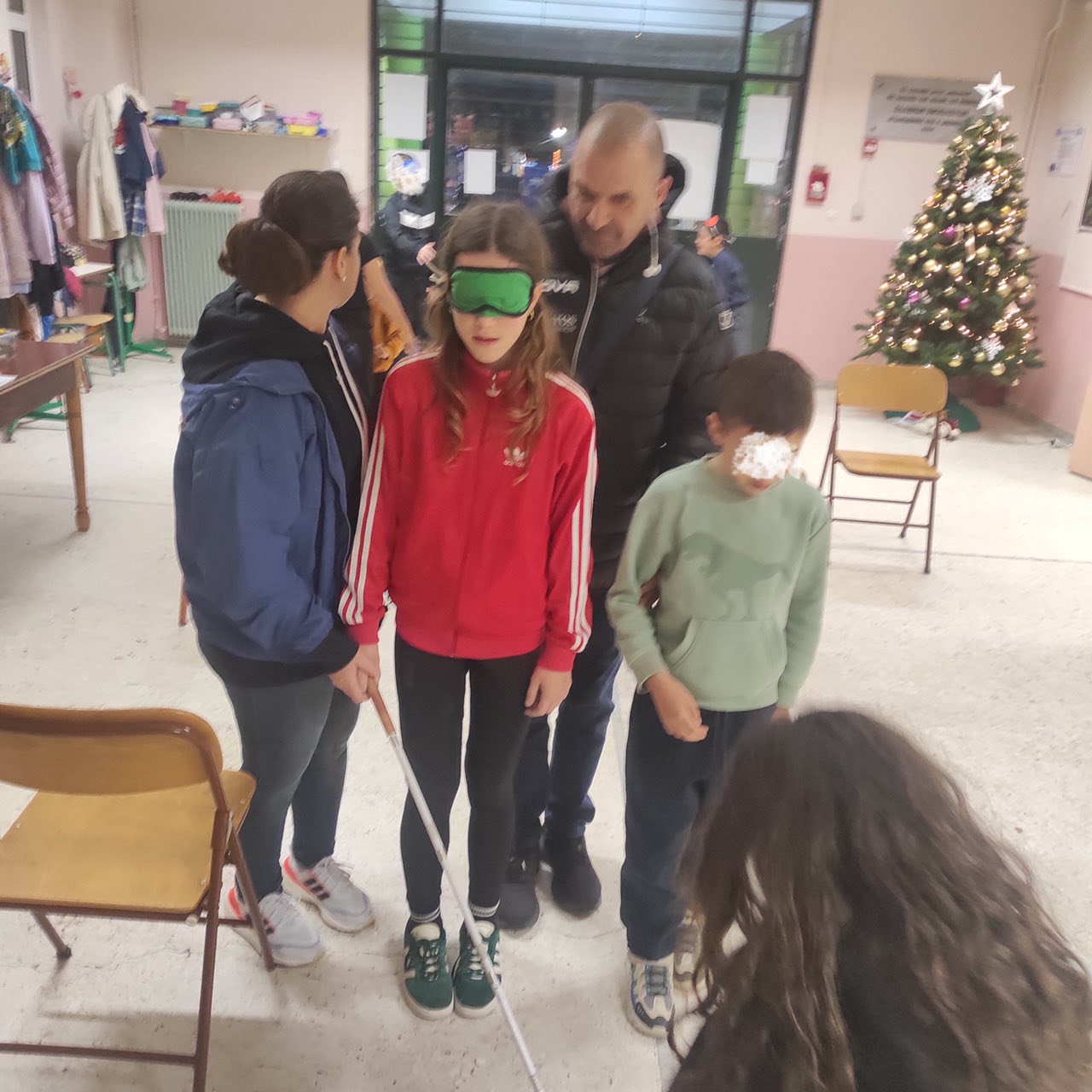 Ακολούθησε μια βιωματική δραστηριότητα που μας εντυπωσίασε: δοκιμάσαμε να περπατήσουμε φορώντας μάσκες, ώστε να νιώσουμε έστω και για λίγο την εμπειρία της απώλειας όρασης. Εκεί συνειδητοποιήσαμε πόσο σημαντικές γίνονται η ακοή και η αφή όταν η όραση λείπει. Ήταν μια άσκηση που μας έκανε να εκτιμήσουμε τη δύναμη, την υπομονή και την προσαρμοστικότητα των ανθρώπων με τύφλωση.