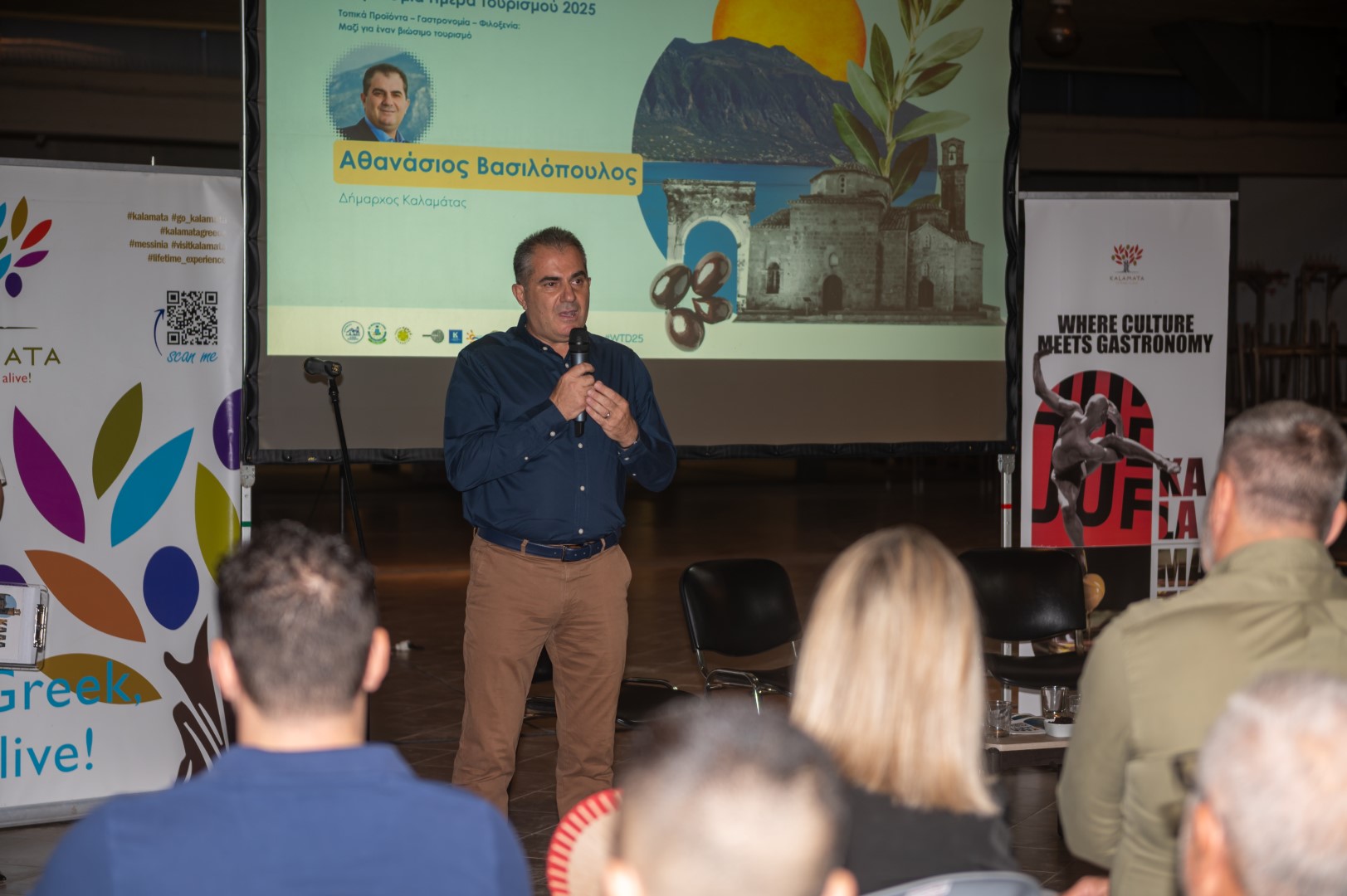 Το Σάββατο 27 Σεπτεμβρίου 2025 ο Δήμος Καλαμάτας, σε συνεργασία με το Επιμελητήριο Μεσσηνίας, την Ένωση Ξενοδόχων Μεσσηνίας, τον Σύλλογο Καταστημάτων Εστίασης και Αναψυχής Καλαμάτας, την Ένωση Μεσσηνίας και τον Πολιτιστικό Οργανισμό «Δρόμοι της Ελιάς», διοργάνωσε εκδήλωση στην Κεντρική Αγορά Καλαμάτας με αφορμή την Παγκόσμια Ημέρα Τουρισμού, που φέτος είχε θέμα του UNWTO «Tourism and Sustainable Transformation».