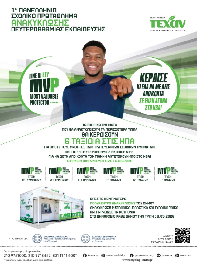 Η ΤΕΧΑΝ Α.Β.Ε.Ε. διοργανώνει το «1οΠανελλήνιο Σχολικό Πρωτάθλημα Ανακύκλωσης», το οποίο έχει ξεκινήσει και θα διαρκέσει έως 15 Μαΐου 2026.