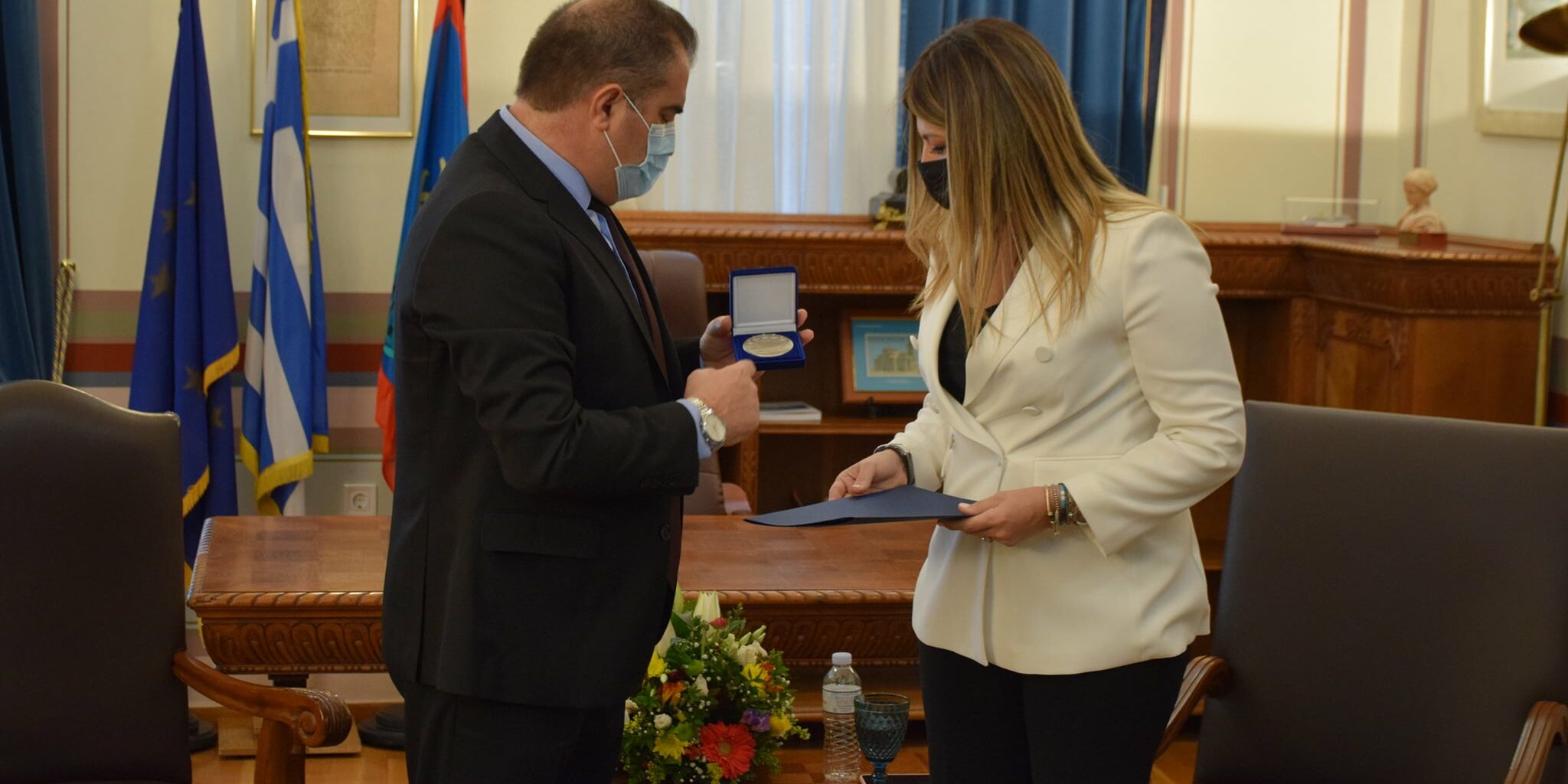 Εθιμοτυπική συνάντηση είχε χθες, Πέμπτη 25 Μαρτίου 2021, στο ιστορικό Δημαρχείο Καλαμάτας, ο Δήμαρχος Θανάσης Βασιλόπουλος με την Υφυπουργό Τουρισμού Σοφία Ζαχαράκη. Στην Υφυπουργό ο Δήμαρχος παρέδωσε το αναμνηστικό μετάλλιο «Πνοή Ελευθερίας» του Δήμου Καλαμάτας για τα 200 χρόνια από την Επανάσταση του 1821.