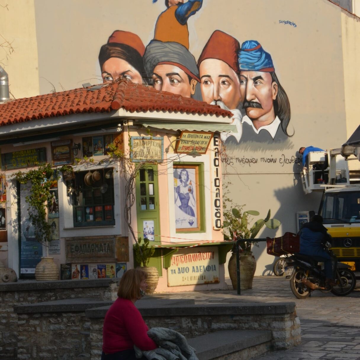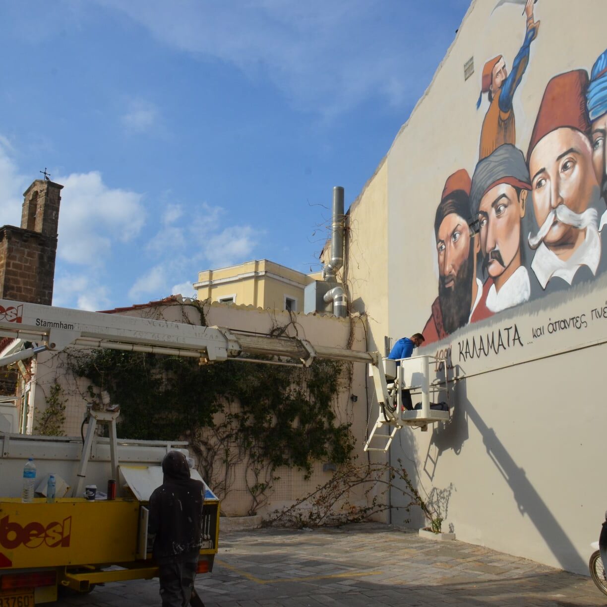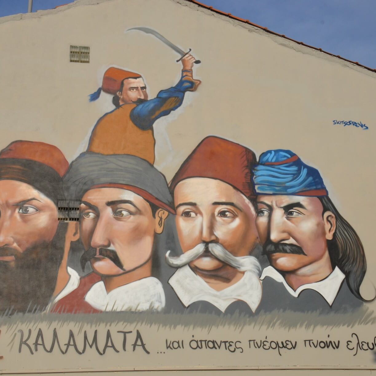 Τις μορφές των οπλαρχηγών του 1821, Παπαφλέσσα (Γρηγορίου Δικαίου), Νικηταρά (Νικήτα Σταματελόπουλου), Πετρόμπεη Μαυρομιχάλη και Θεόδωρου Κολοκοτρώνη, αποτύπωσε σε γκράφιτι, σε τοίχο λίγα μέτρα από τον Ιερό Ναό των Αγίων Αποστόλων στο Ιστορικό Κέντρο της Καλαμάτας, ο γνωστός καλλιτέχνης Skitsofrenis.