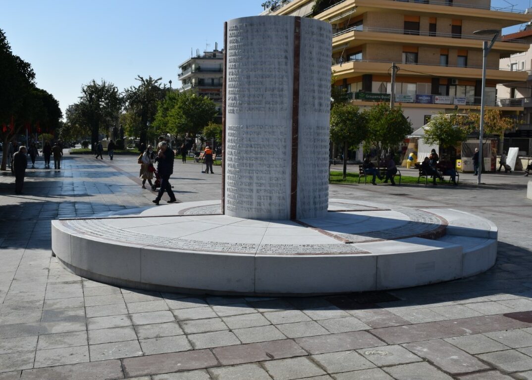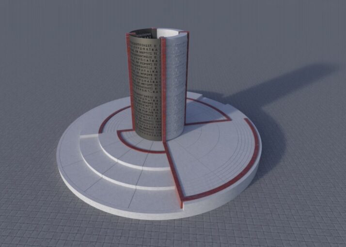 Μέρος των γραμμάτων και συγκεκριμένα τα δύο στοιχεία γραμματικών ενοτήτων που αποδίδονται με εικαστικό τρόπο, είναι αποτυπωμένα πάνω σε ένα μεταλλικό κυλινδρικό στοιχείο, διάτρητα και διαπερατά από το φως. Οι επόμενες δυο ενότητες γραμμάτων δίνονται εξώγλυφα, ιδιαίτερα δυναμικά και στιβαρά στο μάρμαρο. Έτσι, υπάρχει στα δυο κάθετα στοιχεία μετάλλου, δυο λευκού μαρμάρου και 4 κόκκινου μαρμάρου ως μετουσίωση της οριζόντιας διάστασης σε κάθετη.