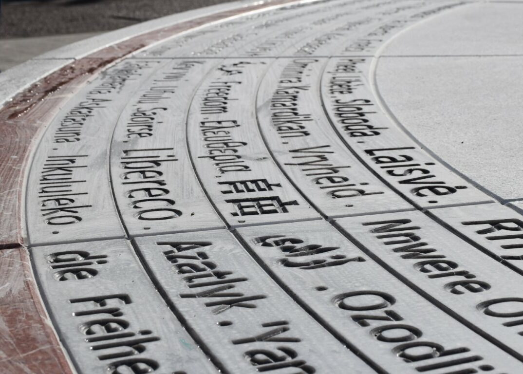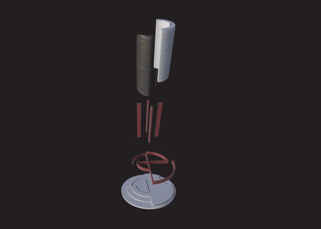 Το φωτογλυπτικό αυτό στοιχείο οπτοκοποιεί την έννοια ελευθέρια, ως άυλη συνέχεια των υλικών κάθετων γλυπτικών στοιχείων.