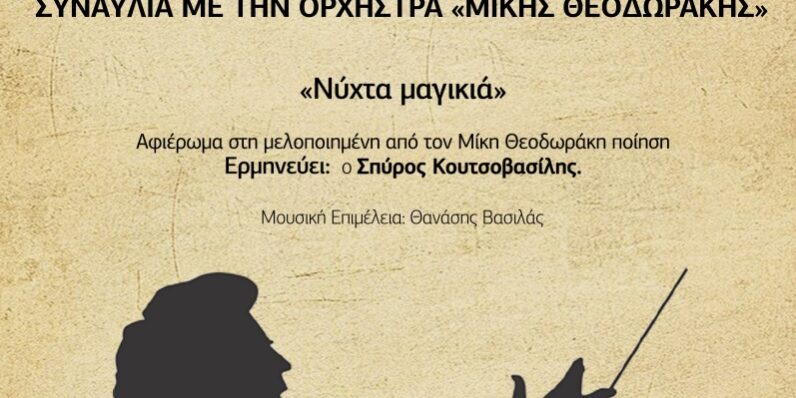 Ο Δήμος Καλαμάτας και η Κ.Ε. Φάρις, στο πλαίσιο του διεθνούς Forum Διπλωματίας διοργανώνουν συναυλία, το Σάββατο 16 Οκτωβρίου 2021 και ώρα 20:00, στο Μέγαρο Χορού Καλαμάτας με την Ορχήστρα «Μίκης Θεοδωράκης». Πρόκειται για αφιέρωμα στη μελοποιημένη από τον Μίκη Θεοδωράκη ποίηση Νύχτα μαγικιά. Μαζί συμπράττει ο Σπύρος Κουτσοβασίλης.