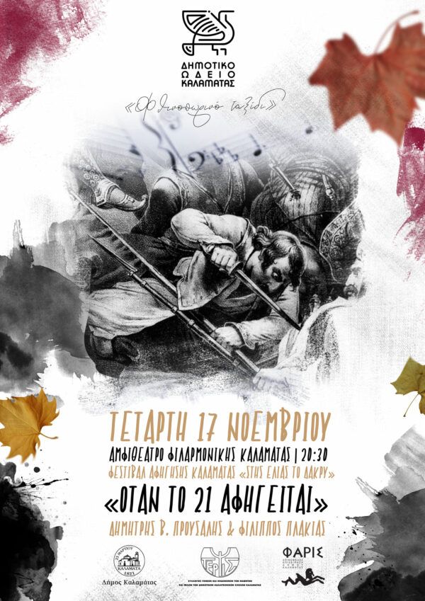 Την Τετάρτη 17 Νοεμβρίου 2021 και ώρα 20:30 στο αμφιθέατρο της Φιλαρμονικής Καλαμάτας το Δημοτικό Ωδείο μας γυρίζει… 200 χρόνια πίσω για να «κρυφακούσουμε» ιστορίες που καλύπτουν το φάσμα της ζωής του Θ. Κολοκοτρώνη από τη γέννησή του ως το θάνατό του. Ο Δημήτρης Προύσαλης, ένας μαγικός αφηγητής σε συνεργασία με τον μουσικό Φίλιππο Πλακιά…