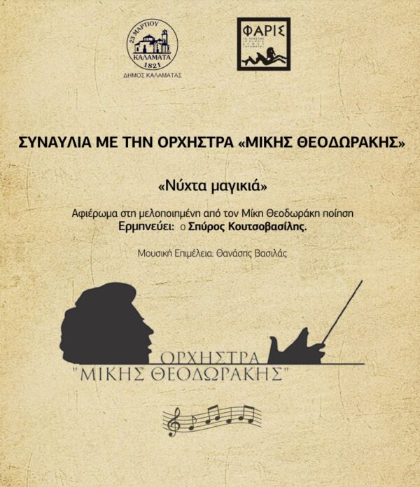 Συναυλία με την Ανεξάρτητη Λαϊκή Ορχήστρα «ΜΙΚΗΣ ΘΕΟΔΩΡΑΚΗΣ», πραγματοποιήθηκε στο Μέγαρο Χορού Καλαμάτας, το Σάββατο 16 Οκτωβρίου 2021, στο πλαίσιο του 1ου Διεθνούς Forum Διπλωματίας Καλαμάτας. Η συναυλία, που διοργανώθηκε από το Δήμο Καλαμάτας και την Κ.Ε. Φάρις, είχε τίτλο «Νύχτα μαγικιά» και ήταν ένα αφιέρωμα στη μελοποιημένη από τον Μίκη Θεοδωράκη ποίηση. Στην ερμηνεία ήταν…