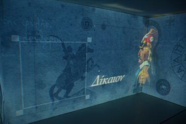 Τα Ψηφιακά Εκθέματα προβάλλονται σε ενιαία οθόνη, που εκτείνεται περιμετρικά σε 3 πλευρές του χώρου (αριστερή πλευρά, κεντρική και δεξιά πλευρά) με ταυτόχρονη επιπλέον προβολή στην οροφή και στο πάτωμα του εκθεσιακού χώρου.